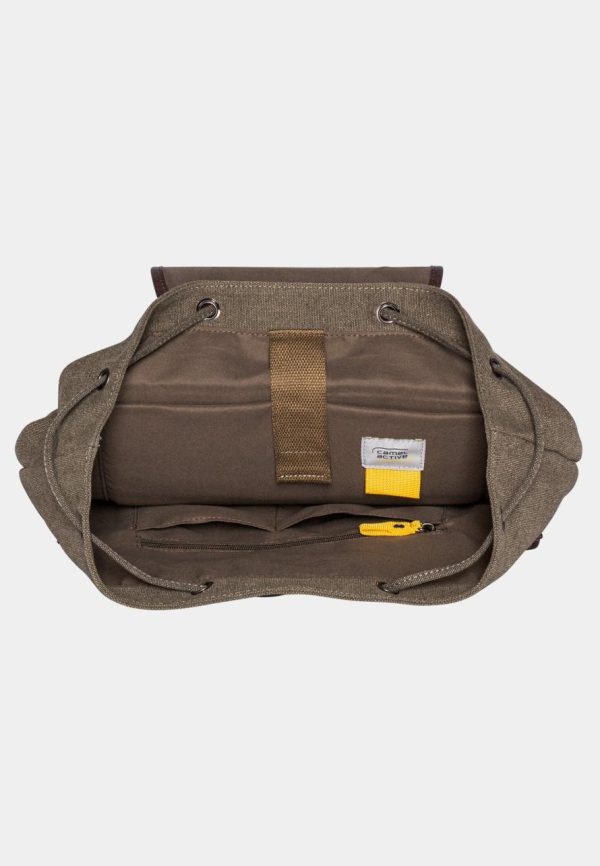 This mountain backpack made of washed canvas is the perfect accessory for on the go. With a practical strap closure and two attached pockets, the mountain backpack offers both style and functionality. The camel active brand label on the closure patch casually completes the backpack.