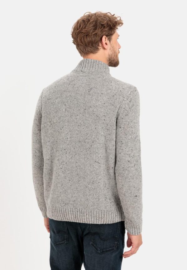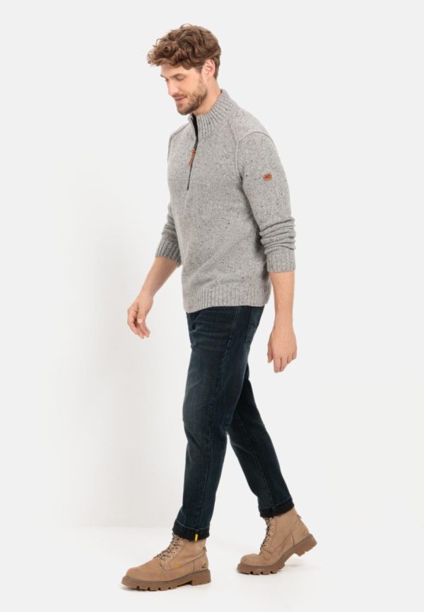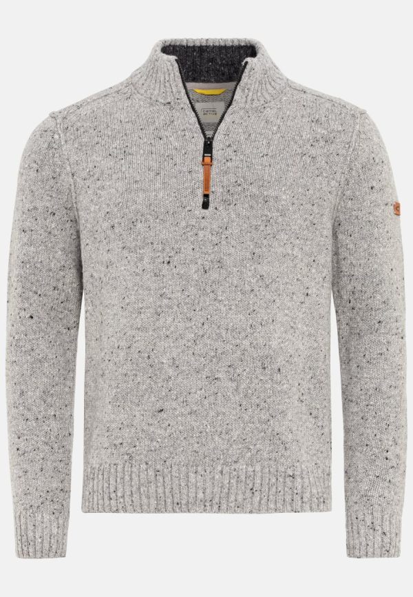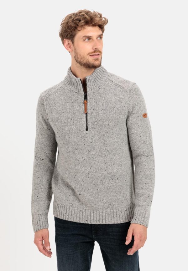 Knitted troyer in a premium wool blend of merino and alpaca. The synthetic fibre content increases durability and ease of care. The warm, regular-fit jumper has a mottled look with visible shoulder seams and a subtly contrasting inner collar. camel active brand details in leather are attached to the zip on the troyer collar and left sleeve.