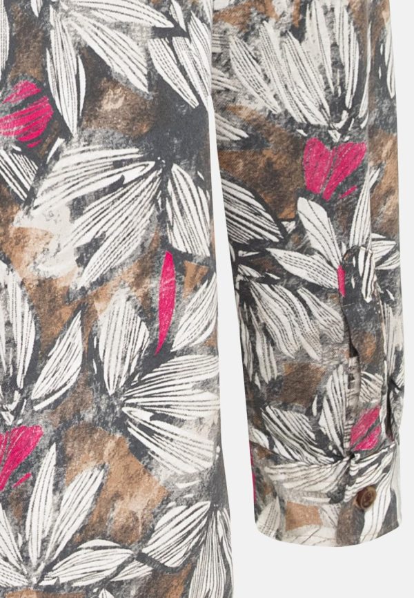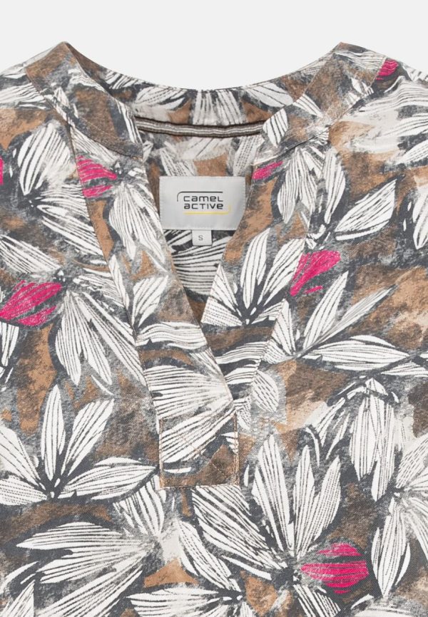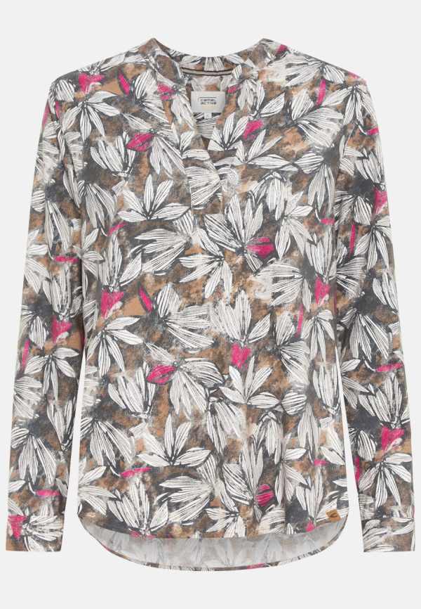 The look and feel of this patterned blouse adds a sense of lightness to your outfits. The soft cotton-viscose blend in a twill texture and the relaxed, regular fit make it particularly comfortable to wear. The slim stand-up collar and V-neckline have the casual charm of a tunic. The all-over floral print in an earthy colour spectrum also lends itself to this casual style. The camel active brand label at the hem is a subtle addition to the overall look.