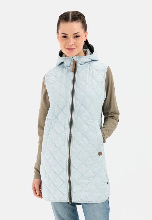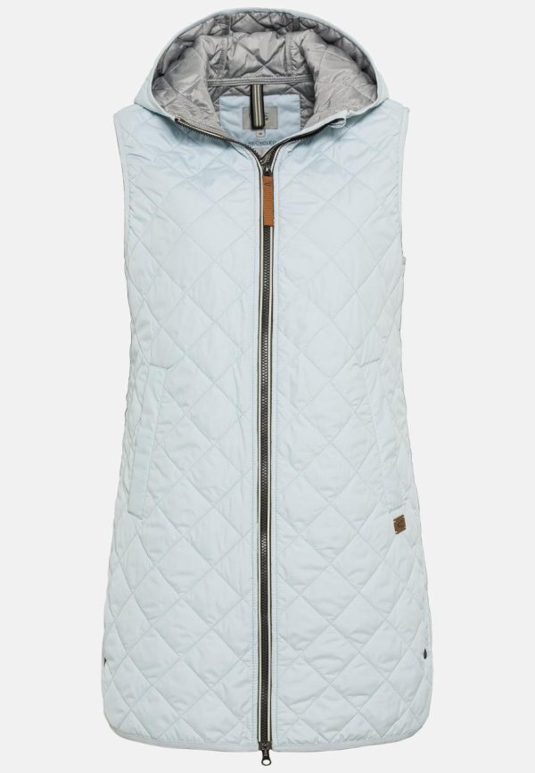 Round off your cool leisure and outdoor looks with this loose-fit sporty vest. It is made entirely from recycled polyester, a fabric which is both windproof and water-repellent, and renowned for keeping its shape well. The lightweight inner padding is down-free and there is a tonal, reflective print on the fixed hood. Stud-fastening side slits add some extra detail to this quilted vest, which also has side pockets and a smooth-running two-way zip.