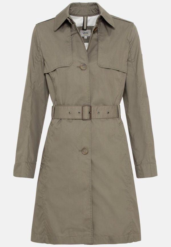 This beautifully crafted coat features a premium cotton blend construction that delivers exceptional comfort while offering a contemporary take on the timeless trench coat design. Its practical, easy-care exterior provides reliable protection against wind and moisture. A sophisticated belt with modern buckle allows for personalized waist customization. The silhouette boasts a flattering feminine cut that effortlessly elevates your everyday wardrobe. Features distinctive camel active brand labeling on both sleeve and back.